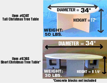 #X36S 34" Diameter Short Christmas Tree Table and 16 self-stick cork floor protectors. Recommended concrete block base for 8 1/4" finished height shown. Base not included.