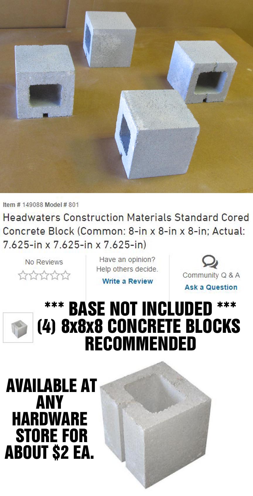 No base is included. The recommended "short" base which makes the table 8 1/4" high consists of (4) 8" square(7 5/8" actual) lightweight concrete blocks